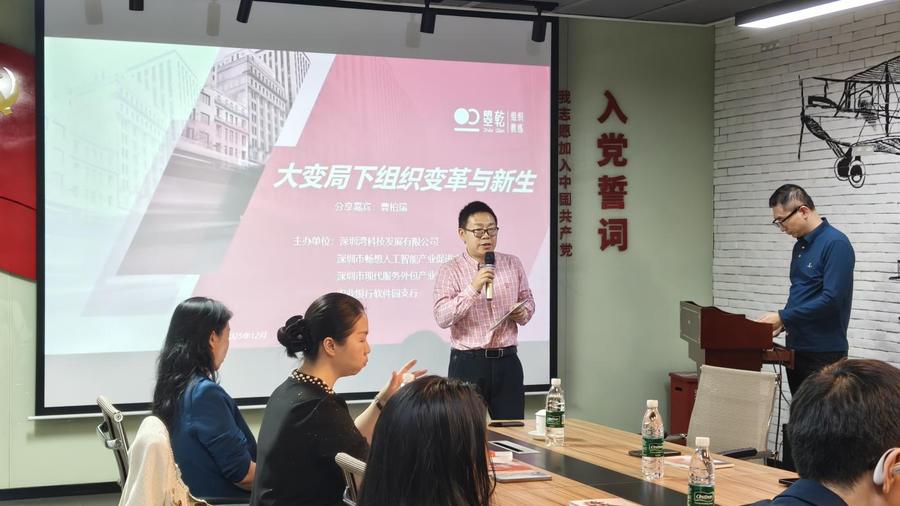 龙华区企业人资服务协会 亿企领航沙龙-智能制造专场12月10日,由深圳湾科技发展有限公司主办,深圳市畅想人工智能产业促进中心、深圳市现代服务外包产业促进会、农业银行软件园支行联合承办的亿企领航沙龙——智能制造专场在软件产业基地3栋二楼新时代大讲 精准定位,汇聚智造领域中坚力量 本次沙龙精准锁定企业营收1亿以上的中高层管理层,吸引了智能制造领域众多优质企业管理者参与。活动从14:30持续至20:00,以主题分享、案例剖析、互动交流结合晚宴的形式,搭建起高质量的行业交流平台,助力企业管理者碰撞思想、凝聚共识。 大咖分享,解锁组织变革核心密码 活动特邀曌乾集团董事长曹柏瑞担任主讲嘉宾。曹柏瑞作为ICF认证大陆第一位MCC(大师级教练)、管理学&心理学双博士,拥有20年+教练从业经验与10000小时高管&组织教练时长,其分享的《大变局下组织变革与新生》主题内容,从理论与实践结合的角度,深入剖析了当前市场环境下企业组织变革的痛点、难点与突破方向。